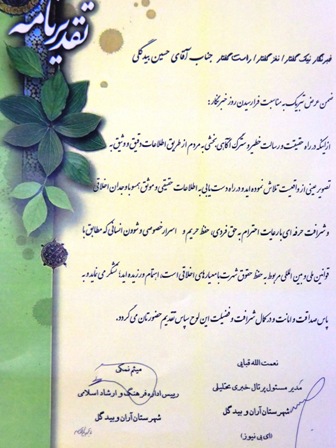 در بخش عکس این مراسم رتبه سوم به یکی از آثارمن که با موضوع بافت تاریخی شهرستان آران و بیدگل بود تعلق گرفت که از طرف برگزار کنندگان جشنواره لوح سپاس به بنده اهدا شد .